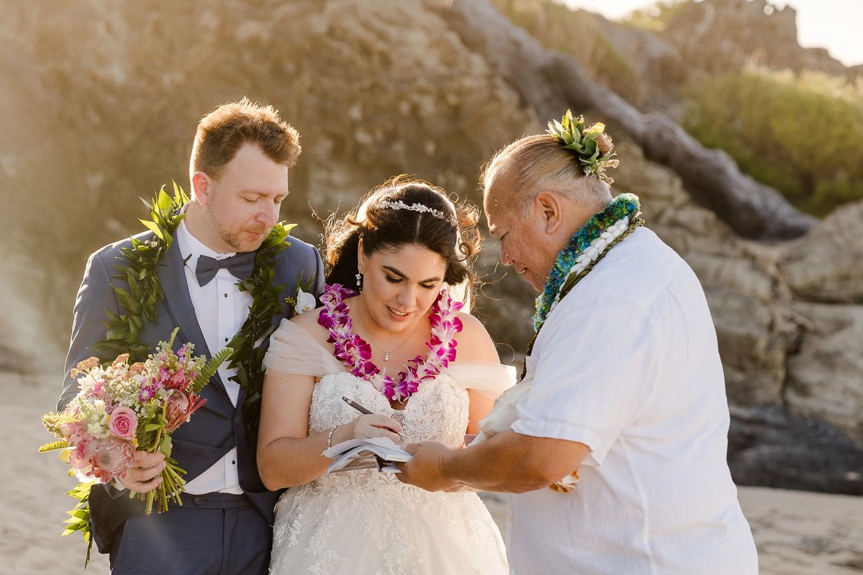 Step Two: Set an appointment with a Hawaii State Marriage License Agent in person before the ceremony. We suggest calling or emailing to make this appointment 30-60 days before your ceremony to get your preferred date and time. When emailing, make sure you give them your Locator ID from your Marriage License Application and your availability to make it easy on them to get you booked! This is a very short meeting prior to the marriage ceremony where the couple will review the application, show ID, and sign the worksheet in the presence of the state agent. The agents are usually available for appointments Monday-Friday 9am-5pm, you may request a Saturday/Sunday appointment (holidays excluded). There is a list of agents on the website, but here’s a list as well.